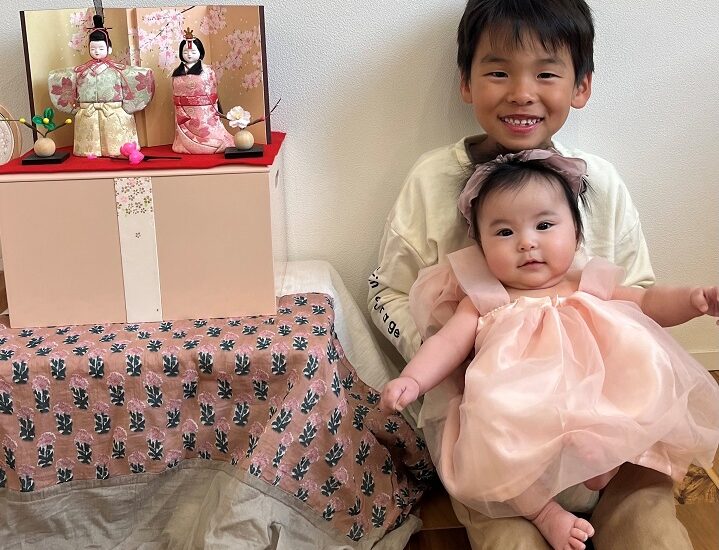 妹さんを抱っこしているお兄ちゃんもとても嬉しそうで、ご兄妹の仲の良さがあふれています。きっと楽しいひなまつりを過ごされたことでしょう。この幸せがいつまでも続きますことをお祈りしております。